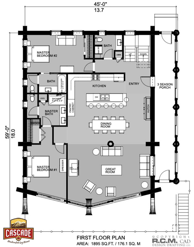 1st Floor Plan – 1895 Sq.Ft. – 3- season porch, great room, master bedroom #1, dining room, kitchen, entry, master bathroom #1, master bedroom #2, master bathroom #2, stairs up and down, bathroom.