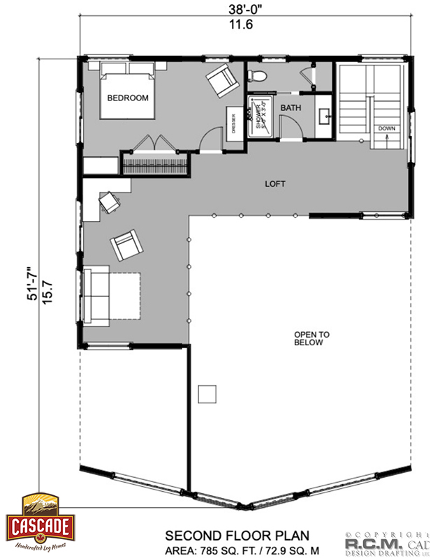 2nd Floor Plan – 785 Sq.Ft. – Loft, bedroom #3, bathroom, stairs, open to below.